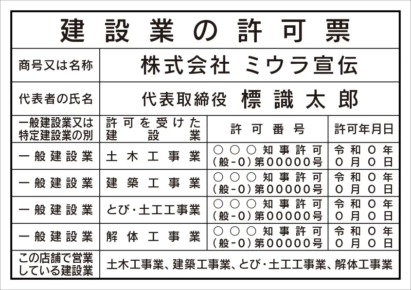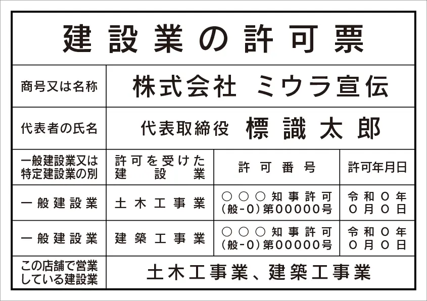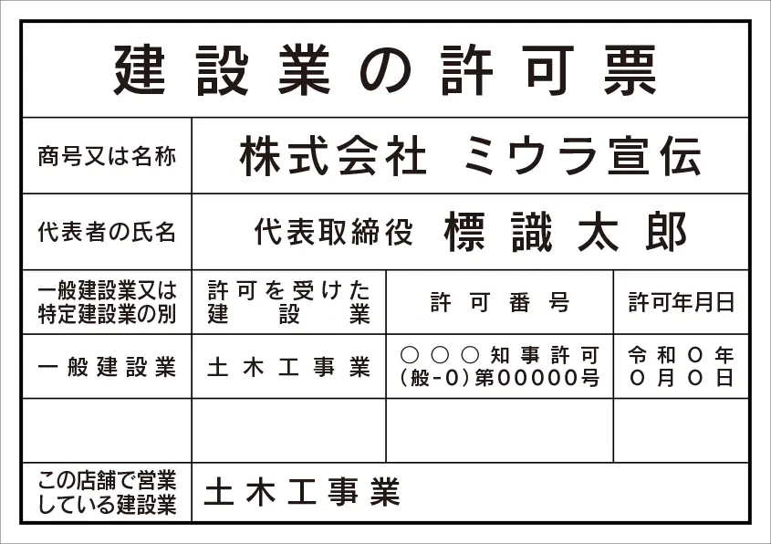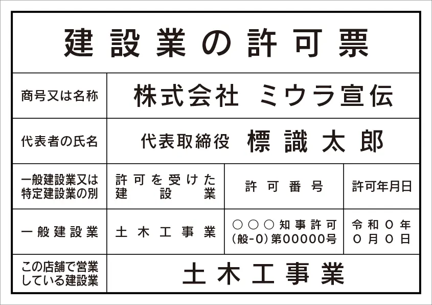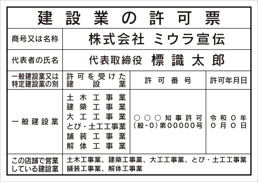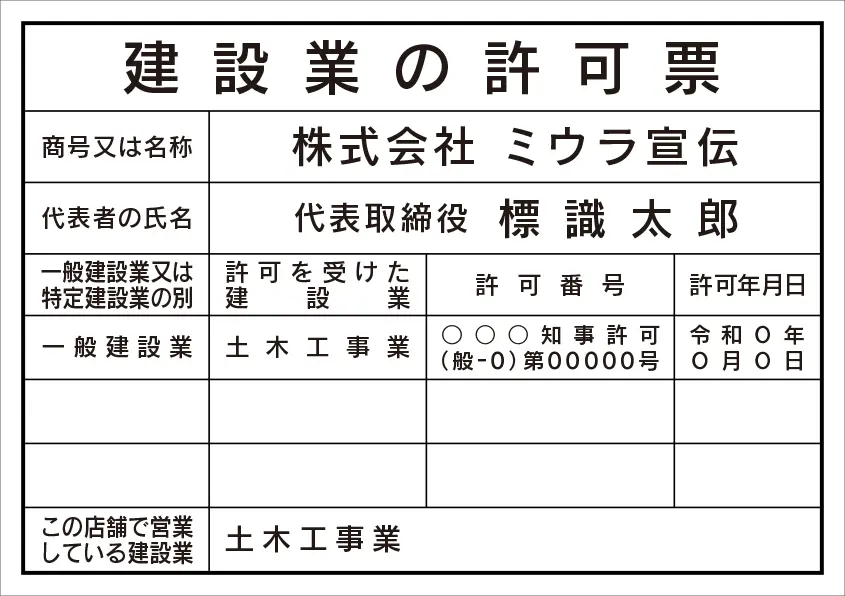 建設業の許可票 レイアウト例