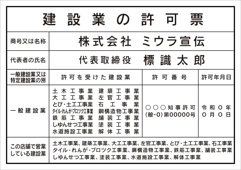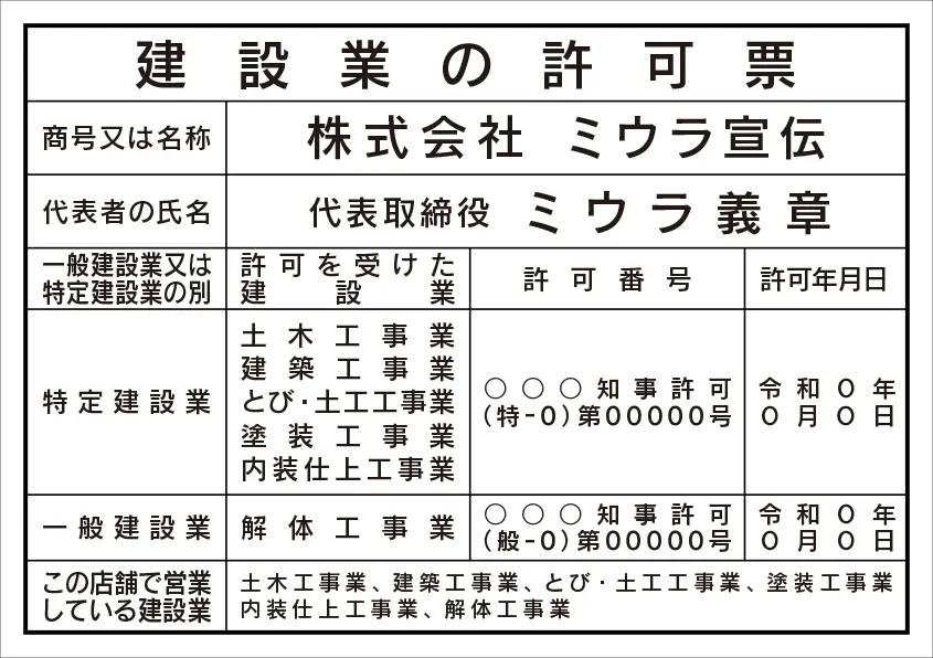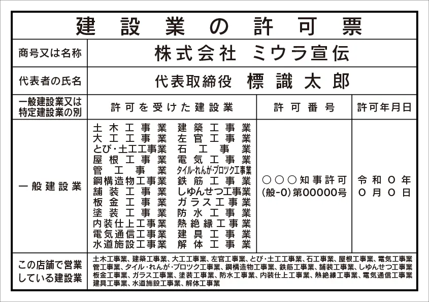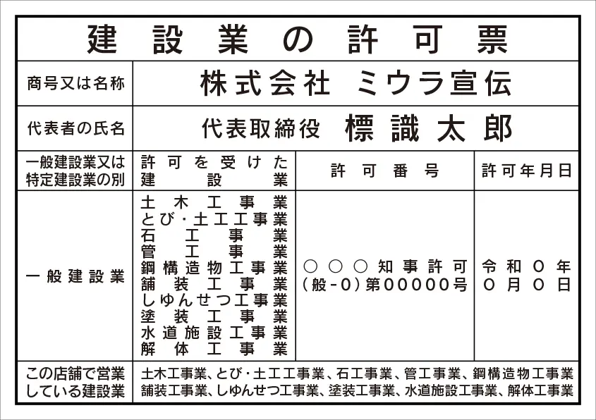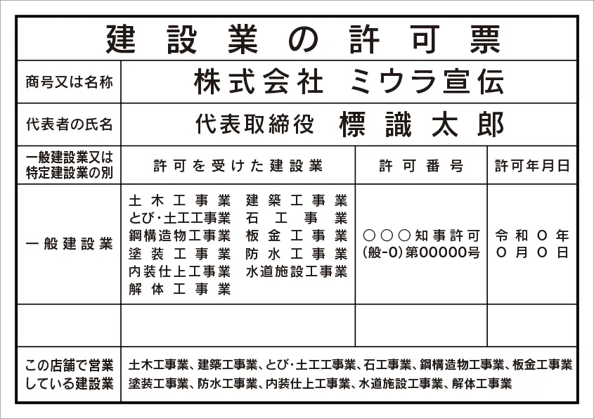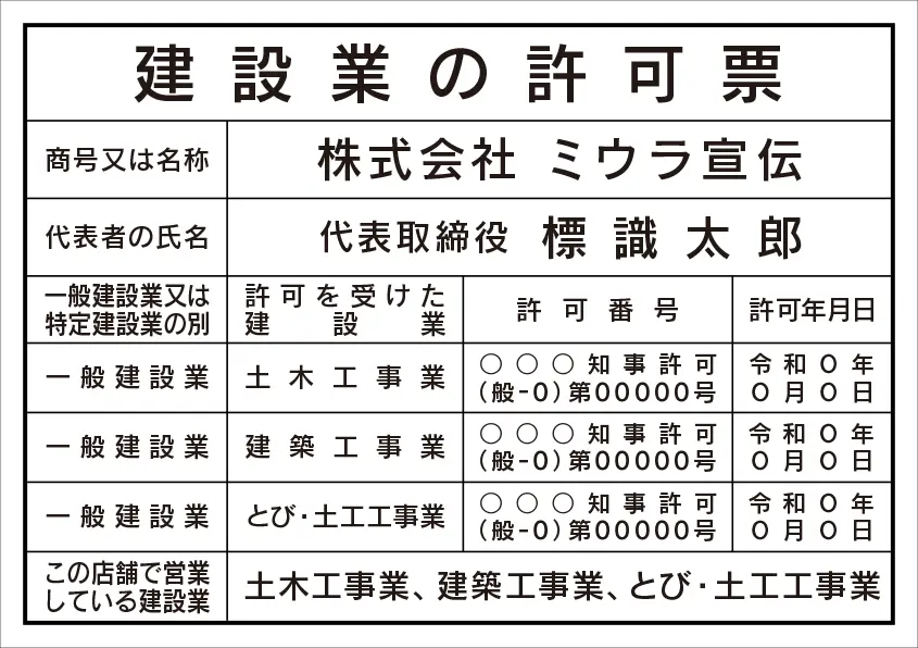 建設業の許可票 レイアウト例